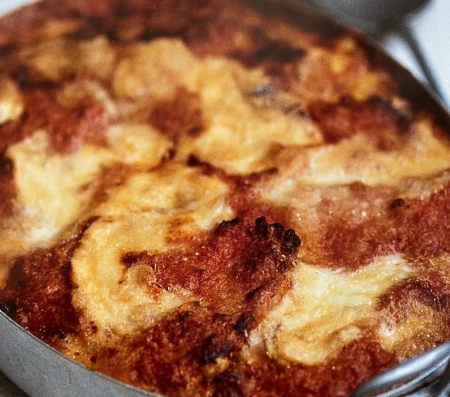 • Now assemble the dish. Put a layer of courgettes slices on the base of a baking dish. Pour over the tomato sauce, and some of the cheeses and then get on with the next layer. Finish with the sauce and Parmesan