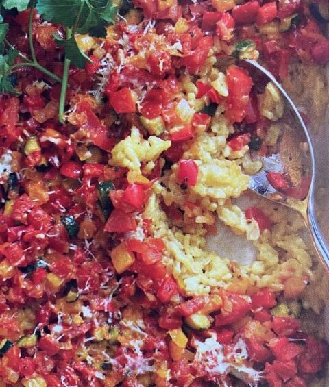 - Sprinkle the ratatouille over the risotto and Sprinkle the grated Gruyere and bake for 10 minutes